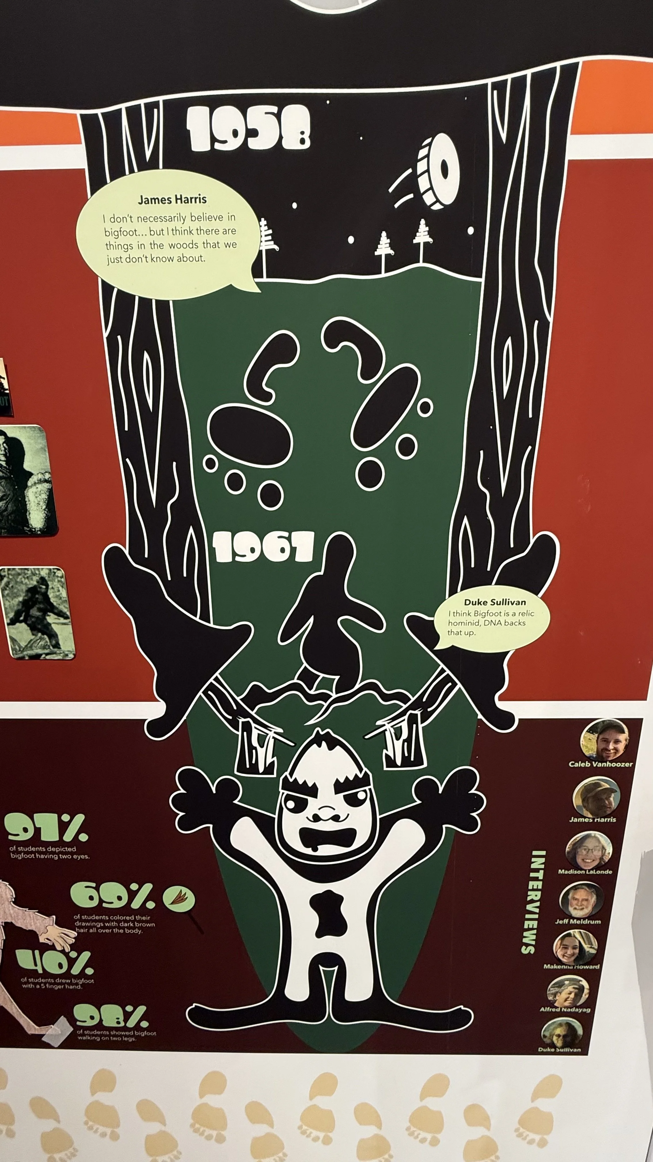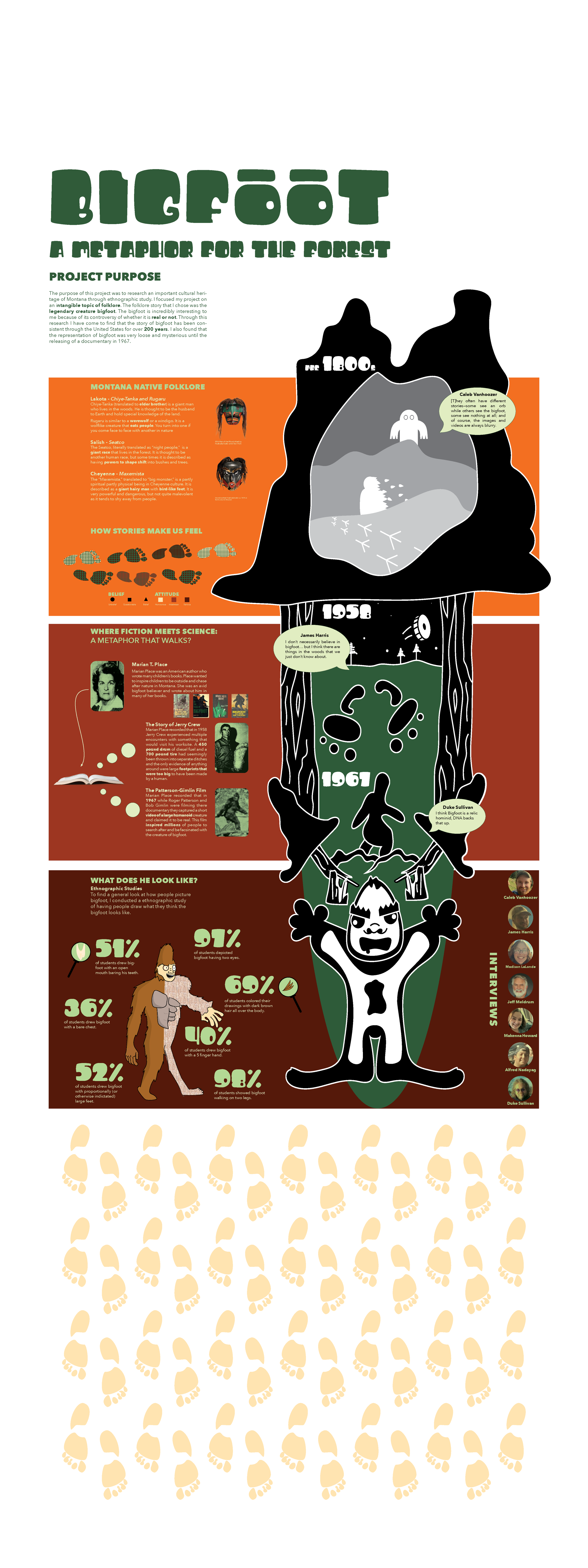The main focus of this project was to analyze how people felt about Bigfoot. This was found out through interviews with people of varying expertise in the subject, students to professional Bigfoot researchers, as well as an ethnographic study of what 4th and 6th graders think Bigfoot looks like.