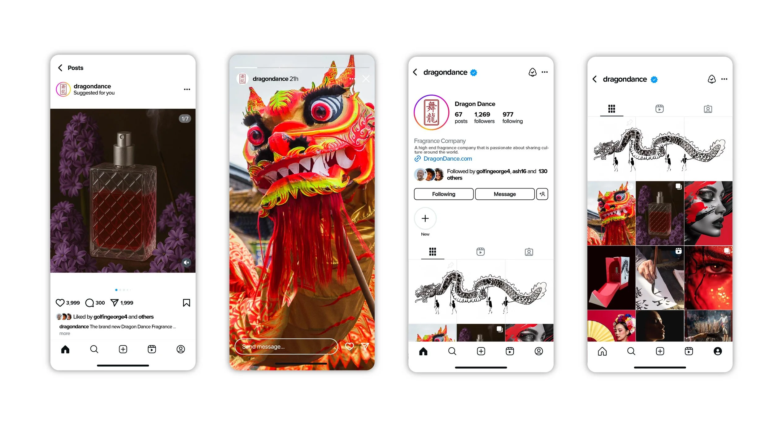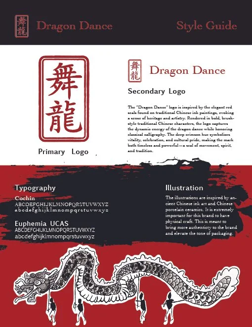 This was an extensive project that covered elements of making a package dieline, design, a company guideline, and a social media campaign. My concept was based around a perfume scent of hyacinth and incense. I wanted to go the route of traditional Chinese art. I was inspired by ink tapestries from antiquity, and the Chinese dragon dance.